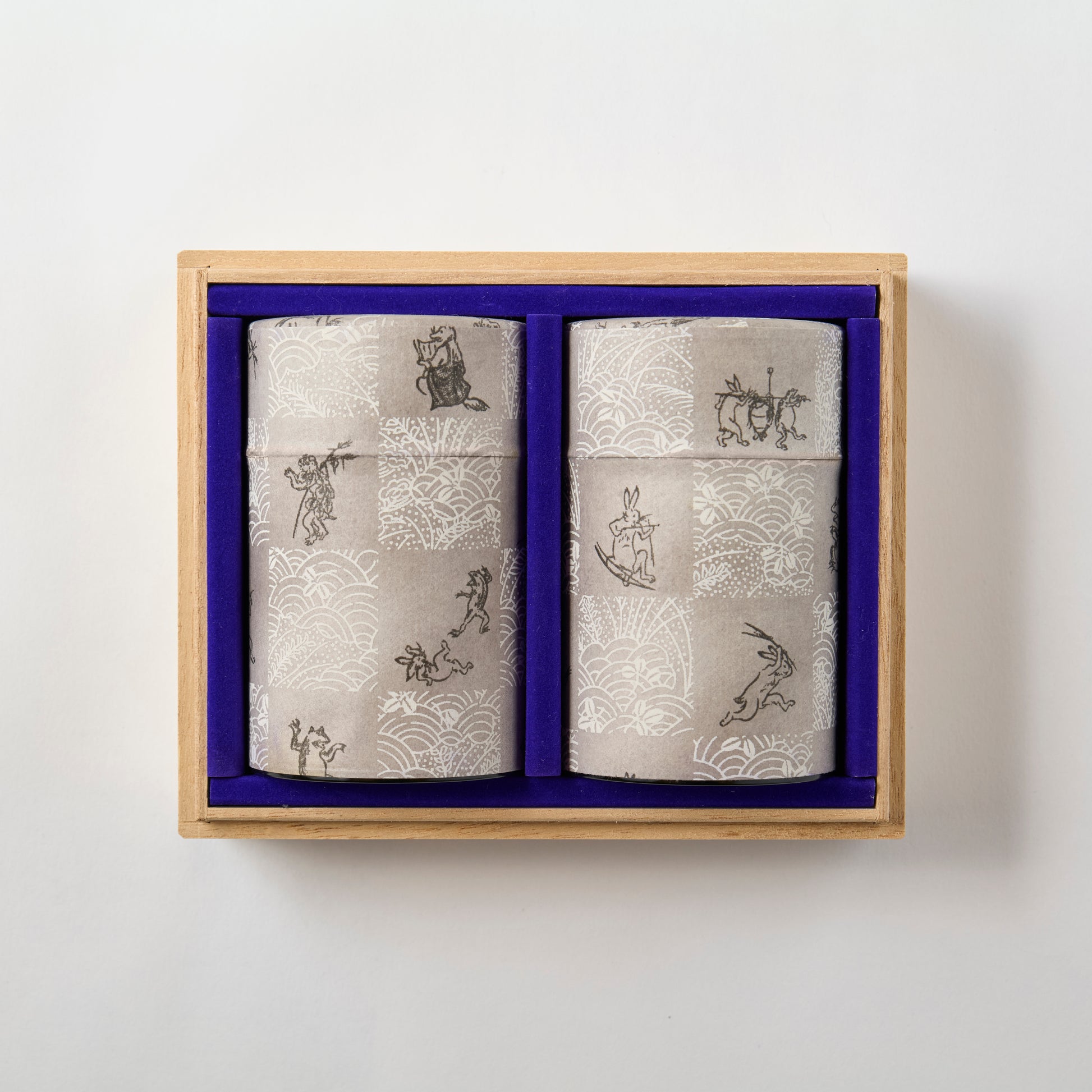 日本最古の漫画「鳥獣戯画」をモチーフにした華やかな茶筒に、それぞれ味わいの異なる2種の深蒸し茶を詰め合わせました。特別に仕入れた限定缶は、飲み終えた後も茶筒として日常にお使いいただけます。